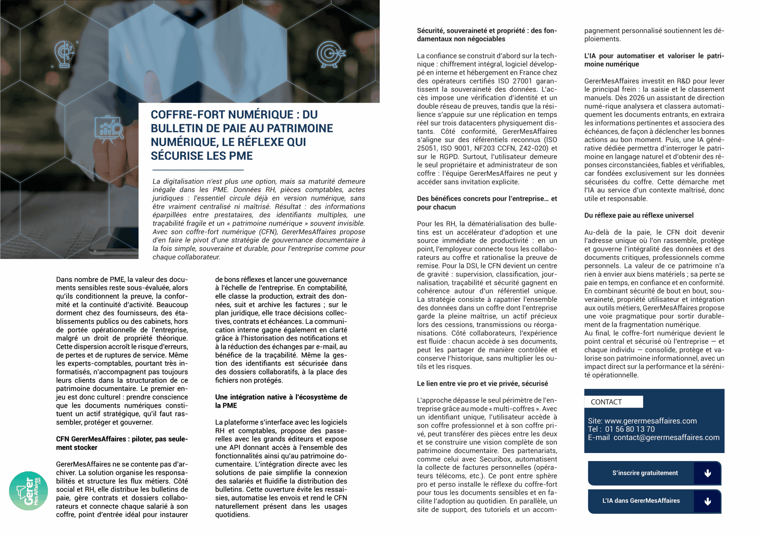 Parmi les acteurs du marché, GererMesAffaires propose une offre de coffre-fort numérique professionnel robuste, intuitive et conforme aux normes les plus strictes. Grâce à ses nombreux services intégrés, les entreprises peuvent bénéficier d’un espace de stockage hautement sécurisé, accessible depuis tous les supports, et administrable de manière simple et collaborative.